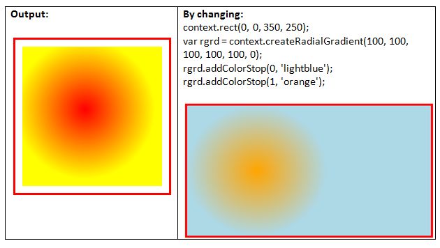 One additional method is also used for adding two or more color stops once we have a gradient object. The method is addColorStop(offset, color) that adds a color stop with the given color to the gradient at the given offset value. Gradient position can be anywhere between 0 & 1. For example, 0.0 is the offset at one end and 1.0 offset at the other end. If the offset value does not lie between 0 & 1, then INDEX_SIZE_ERR is raised and if the color is not parsed as CSS <color>, SYNTAX_ERR is raised.