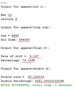 - System.out.println("Output for append(double d):");