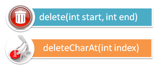 delete(int start, int end) removes or deletes the characters from a substring of the given sequence. The chars of the substring lie between the index values startIndex and endIndex-1 or to end of the given sequence if no such characters exit. No changes are made if the index values of the start and end are equal. It throws StringIndexOutOfBoundsException() if the value of start is negative or greater than the length of the given sequence or greater than the end value.