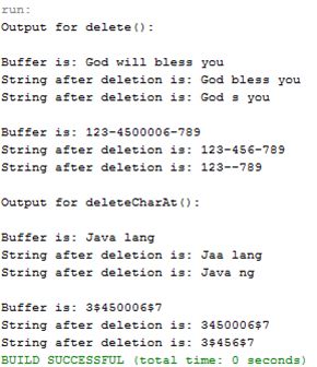In the preceding output we can observe that for deleteCharAt(), when we apply the method in continuity, the next character (char positioned after the deleting char) shifts its index position one less after each deletion and comes at the index position of the previous char. That is why the index value given in the example is the same for all continuous methods.
