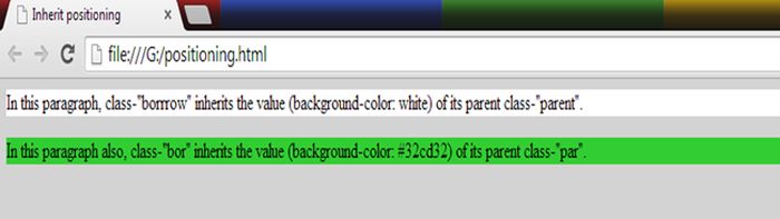 - In this paragraph also, class-"bor" inherits the value (background-color: #32cd32) of its parent class-"par".