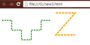 - <polyline points="220,10 300,10 220,100 300,100" style="fill:none;stroke:orange;stroke-width:5; stroke-dasharray:10 3" />