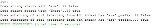 - System.out.println("Does string starts with 'There'..?? "+str1.startsWith("There")); System.out.println("Does substring of str1 (starting from 4th index) has 'are' prefix..?? "+str1.startsWith("are",4));