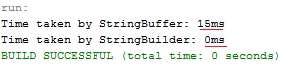 You can see that, StringBuilder is faster than StringBuffer since it is performed in 0ms whereas StringBuffer is performed in 15ms.