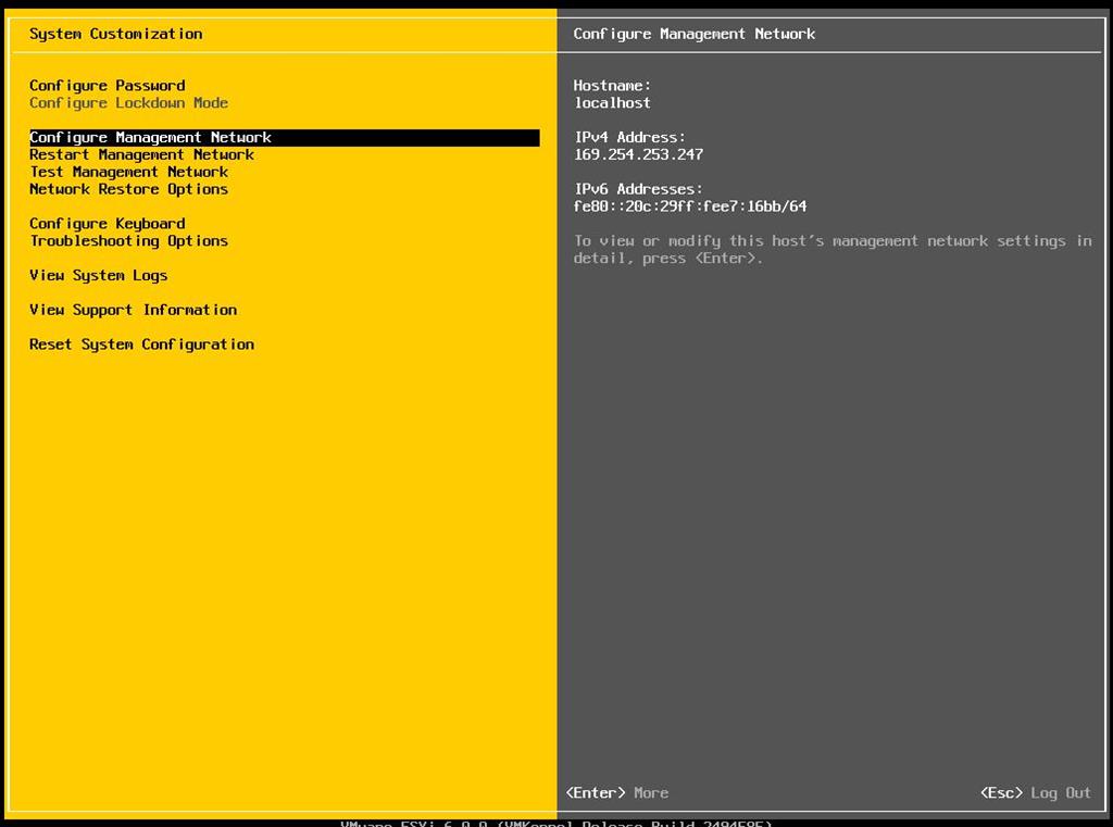 - Now to assign the IP Address to the server press F2 and it will prompt for username and password, put root credentials which we had set during the ESXi installation and select Configure Management Network and hit enter and you should get the following screen,