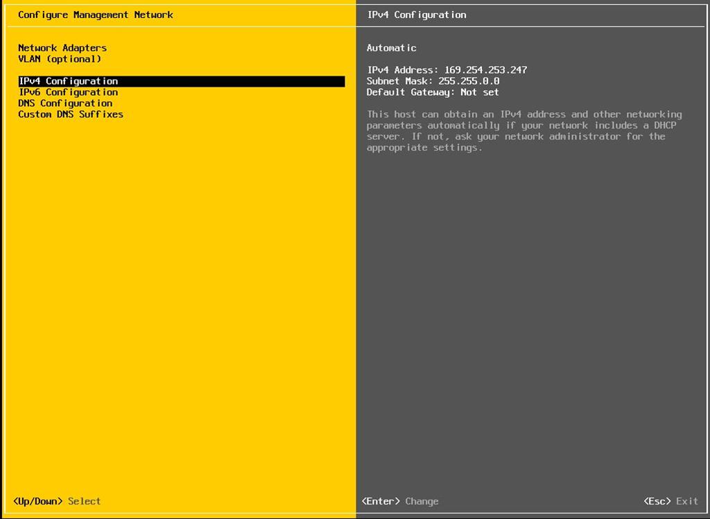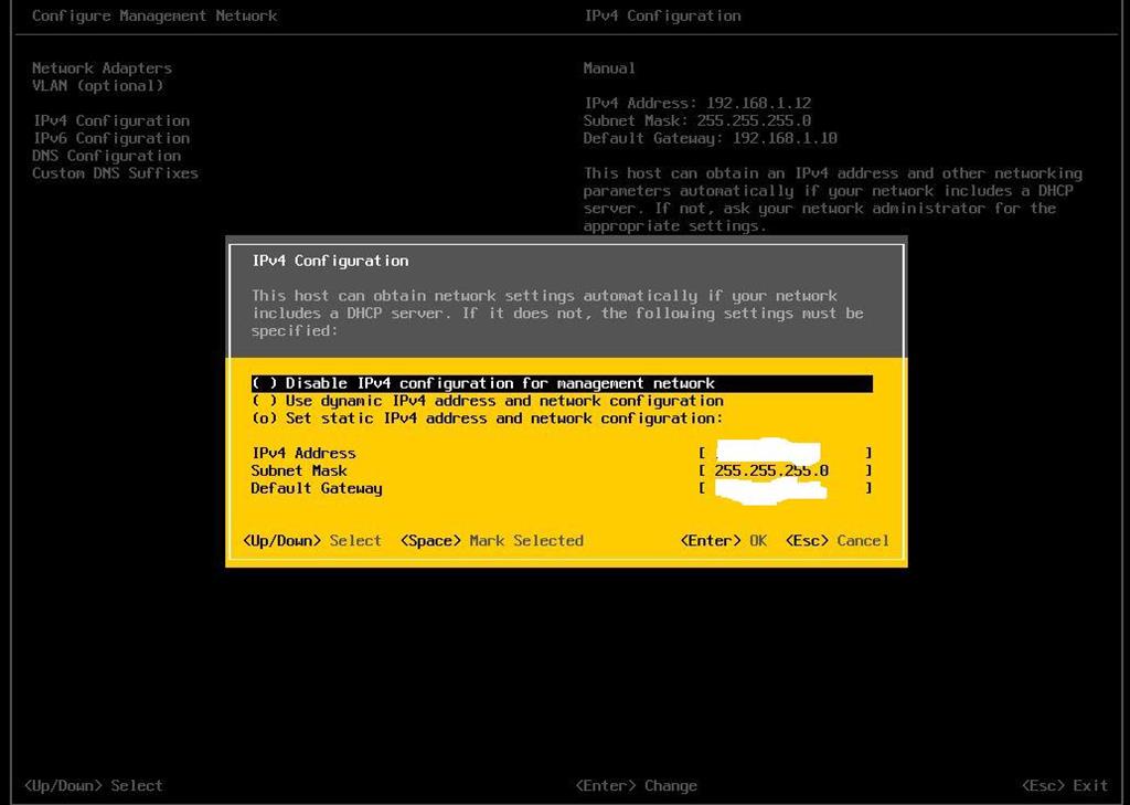 - You can make it to set IP address as DHCP and also you can set it to static IP Address. Here I am setting it to use static ip address, select static IP Address and enter the IP and hit enter and it will ask to restart management network click yes.