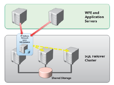 SQL Server failover clustering is based on Windows Server Failover Clustering (WSFC). Clustering protects against the failure of the actual database server hardware, whereas mirroring protects against the failure of the data itself. Using WSFC and a shared storage platform, such as iSCSI or fiber channel-based storage, enables you to create a High-Availability instance of SQL Server. A High-Availability instance of SQL Server includes elements such as the instance network name and IP addresses, in addition to the databases running on that instance. This means that applications, such as SharePoint, that are running on the databases do not need configuration of a failover server setting. If a server in the cluster fails, the entire SQL instance, including storage access, network name, IP address and supporting Windows services, fail over to another node in the cluster and the application is able to access the databases without reconfiguration. Because of the requirement for the WSFC feature, SQL failover clustering requires that SQL Server be installed on Windows Server Enterprise or Datacenter editions. You can use SQL Server Standard edition to create a two-node failover cluster. You can use SQL Server Enterprise edition to create a failover cluster using the maximum number of nodes supported by the operating system. Windows Server 2008 R2 supports clusters up to 16 nodes; Windows Server 2012 supports clusters up to 64 nodes.