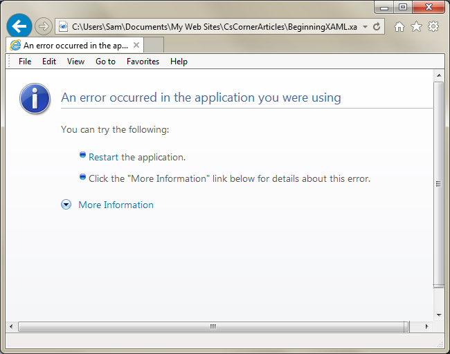 IE directly then it won't work. The XAML in this article will do nothing except create the corresponding window; there is no "code behind" so if you click on a button, nothing happens. The XAML in this article is not good for anything except for learning purposes.