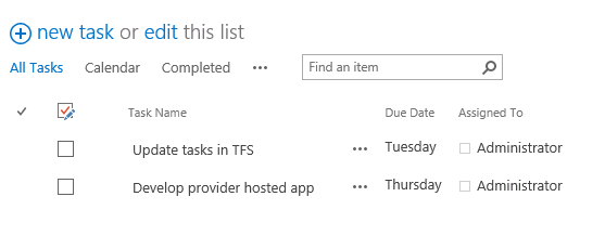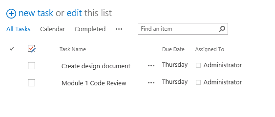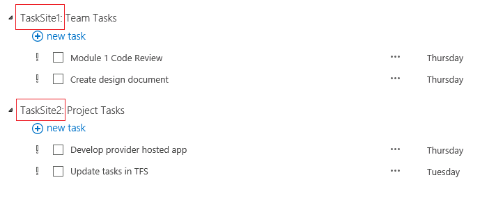 Alternatively, navigate to the following URL: "/personal/USERID/AllTasks.aspx". In the tasks list, you'll see the combined list of tasks from both the SharePoint sites we created for testing.