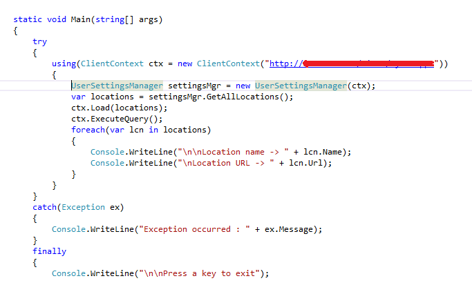 We will the use of the client API of the Work Management Service to retrieve information related to our tasks. In work management terminology, "LOCATIONS" are the places where the tasks are stored. Let us try to retrieve the locations using the client-side object model. For demo purposes, I am writing the code in a console application.