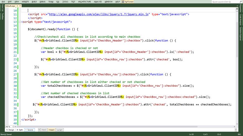 This article explains how to check or uncheck all checkboxes in your GridView using jQuery. Use the following procedure to do that.