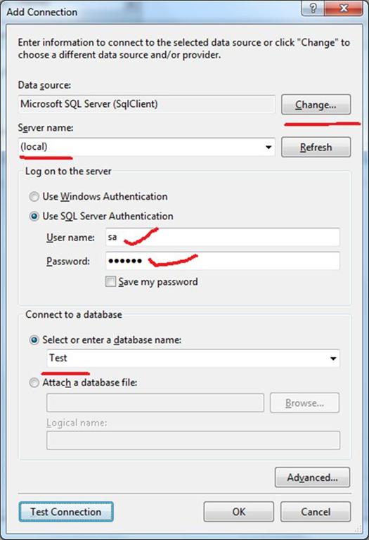 - Server name: your server IP or Local (I am using the local databases of my system)