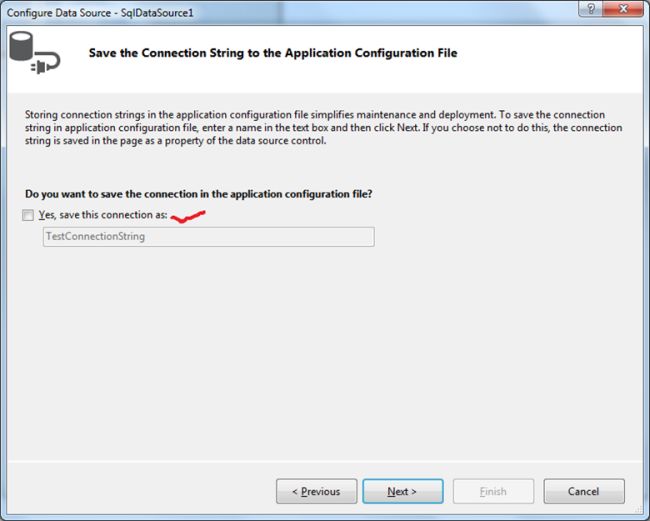 After clicking the "OK" button it shows the following window and you can save the connection string if you click on the checkbox. Click the "Next" button.