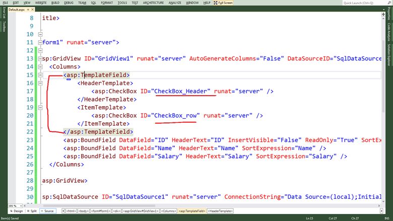 Step 2: Create a "TemplateField" field into the columns section of the gidview that has the Header template for the header checkbox named "CheckBox_Header" and itemtemplate from the row checkbox named "CheckBox_row" as in the following: