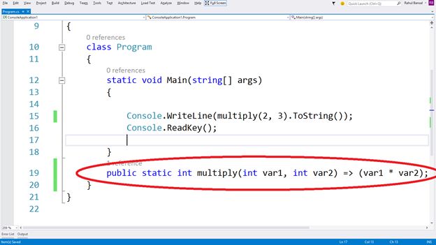Sometimes we create small functions with 1 or 2 lines to do some task or activities like conversion or printing. So in C# 6.0 this feature allows us to optimize that function with a “Lamda Expression” like: