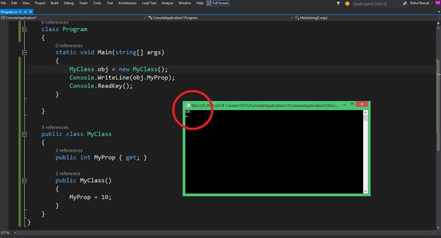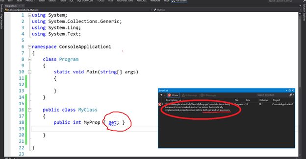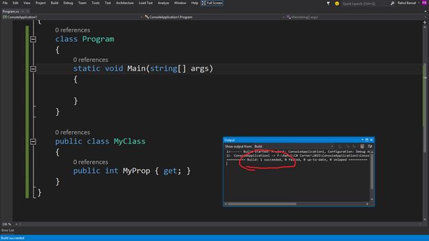 After creating the project, I will create a class named "MyClass" with a property named "MyProp" only with a "get" in the "program.cs" and build the application.