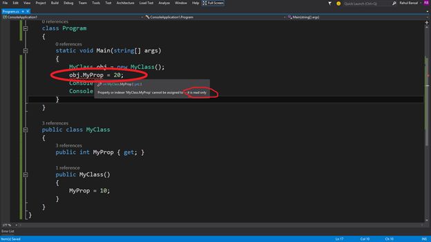 In C# 6.0, when we write a property only with "get", it automatically becomes a Read Only property. For more explanation I am writing an example with some code where we declare a property with only a "get", assign a value in it and access it with the object of that class.