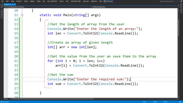 - Call the function with the 2 parameters, array and sum in the main() method.