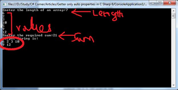 - If I provide ”7” as the length, “6,2,3,10,5,9,12” as values and "21" as the sum then the output will be like:
