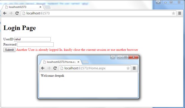 - lblmsg.Text = "Another User is already logged In, kindly close the current session or use another browser";