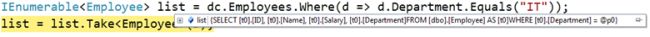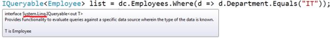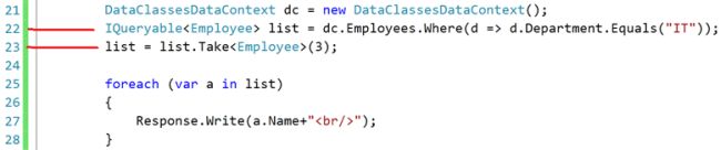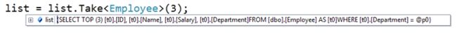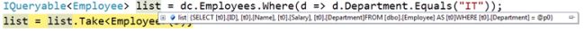 In this article I will demonstrate how to write code via IEnumerable and IQueryable and what the differences are between them.IEnumerable and IQueryable are used for data manipulation in LINQ from the database and collections.For getting the data from the database, I have created a table named "Employee" that has some data and looks like:Then creating the Data Context class (.dbml class) in your project that converts the database table named "Employee" as a class.Now I will tell you the functionality and some basic differences between IEnumerable and IQueryable using the object of the Data Context class..IEnumerable CodeSQL statement after execution of above queryAfter the execution of line number 18, the SQL statement will look like the following until the end:IQueryable CodeSQL statement after execution of the preceding queryAfter the execution of line number 22, the SQL statement will look like:But after the execution of line number 23, SQL statement will add the Top for the filtering.In both syntaxes I am accessing the data from the Employee table and then taking only 3 rows from that data. DifferencesIEnumerable