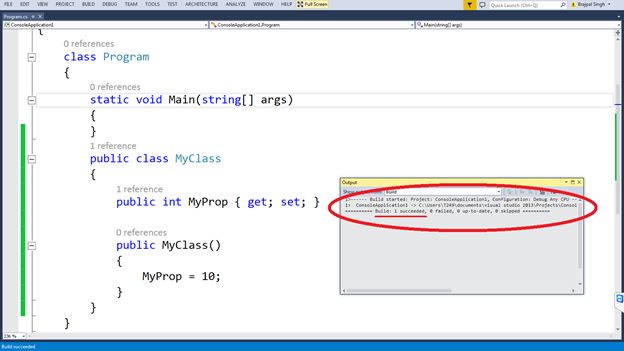 After creating the project, I will create a class named "MyClass" with a property named "MyProp" only with a "get" and "set" in "program.cs".