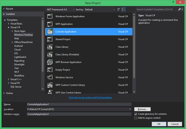 Open Visual Studio 2015 and select "File" -> "New" -> "Project..." and fill in the project name as "Console Application1".