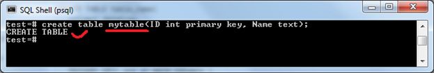 Now, we will create a table in the "test" database with the name "mytable" as shown in the following screenshot. Table is created in the same way as it gets created in any Relational Database Management System (RDBMS) database such as Microsoft SQL Server.