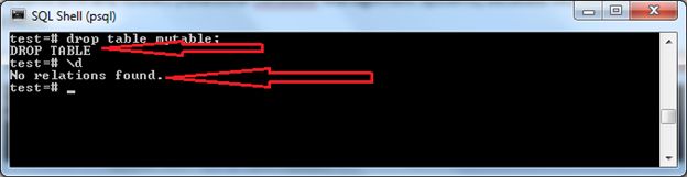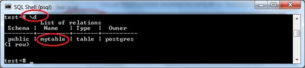 If you want to see all the tables in the "test" database, use /d in the selected database. Here, our selected database is "test".