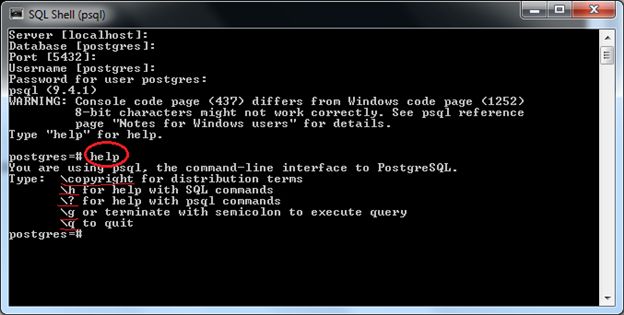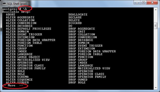 \h: for help with SQL commands, type \h and press enter to learn more of this type.