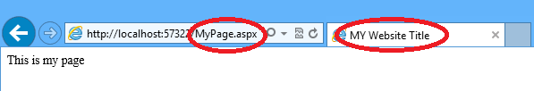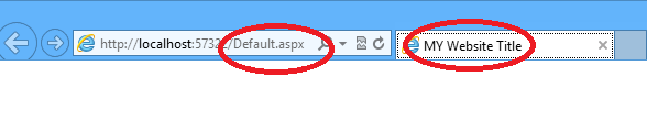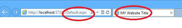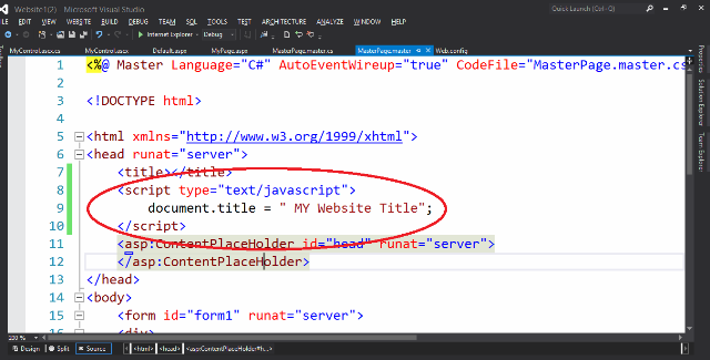 This way is client-side because JavaScript is used to set the title of the page. There is no need to change the Web.Config file. It is a very simple way compared to the first way.Just write the single line of the following code in the <Script> tag:document.title = " MY Website Title";Now you can write this code in a common file, it can be a master page and any user control file like header or footer.Matser Page: Add a Master page named "Masterpage.master" to the website.And now add the following code in the <script> tag in the <head> tag of the "MatserPage.master".