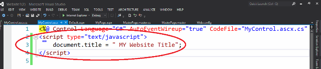 Here the "Title" name should be the same as what you created in the Web.Config file.Add a Web Form named "Default.aspx" to the website without adding a master page.Add the "MyControl.acsx" to the "Default.aspx" page as in the following:Now run the page.Through Client Side using JavaScripts