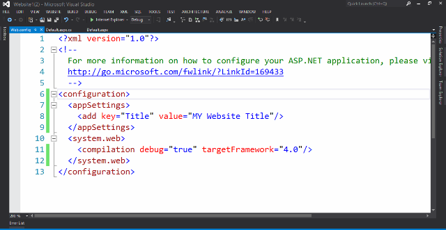 Here Key is the "Title" and its value is "MY Website Title".Now you can access this key in a common file such as a master page and any user control file like header or footer.Matser Page: Add a Master page named "Masterpage.master" to the website.And now add the following code on page_Load event in the .cs file of the Master Page.