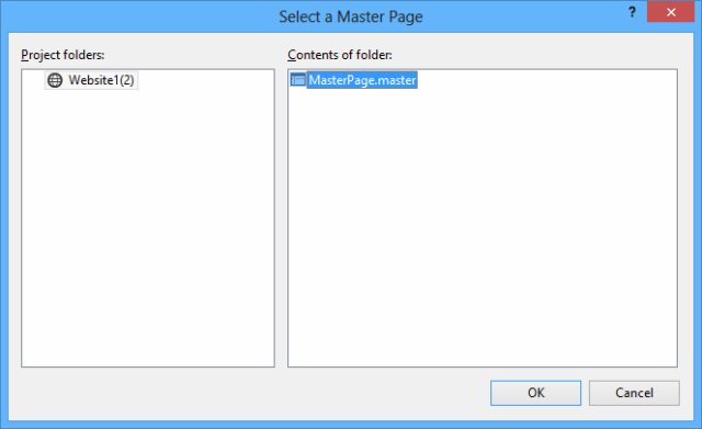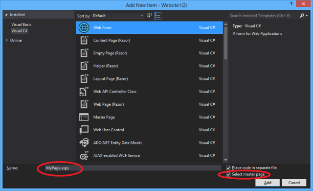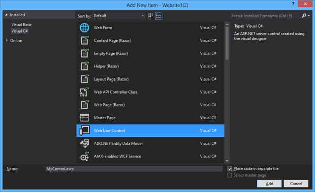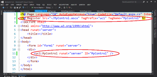 Now add the web form named "MyPage.aspx" to the website.And select the master page.Now add some text on page only for identification and run it.Web User Control: Add a Web User Control named "MyControl.acsx" to the website.And now add the following code to the <script> tag in the <body> tag of "MyControl .acsx".