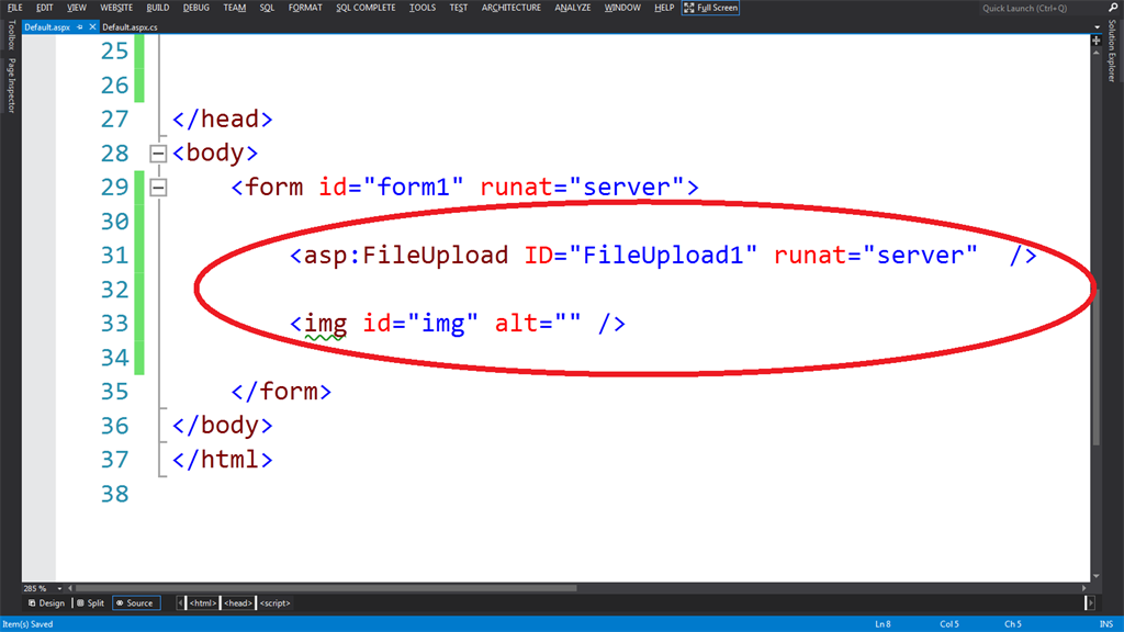 Add a File upload control named "FileUpload1" and an image control of HTML named "img" to the page.
