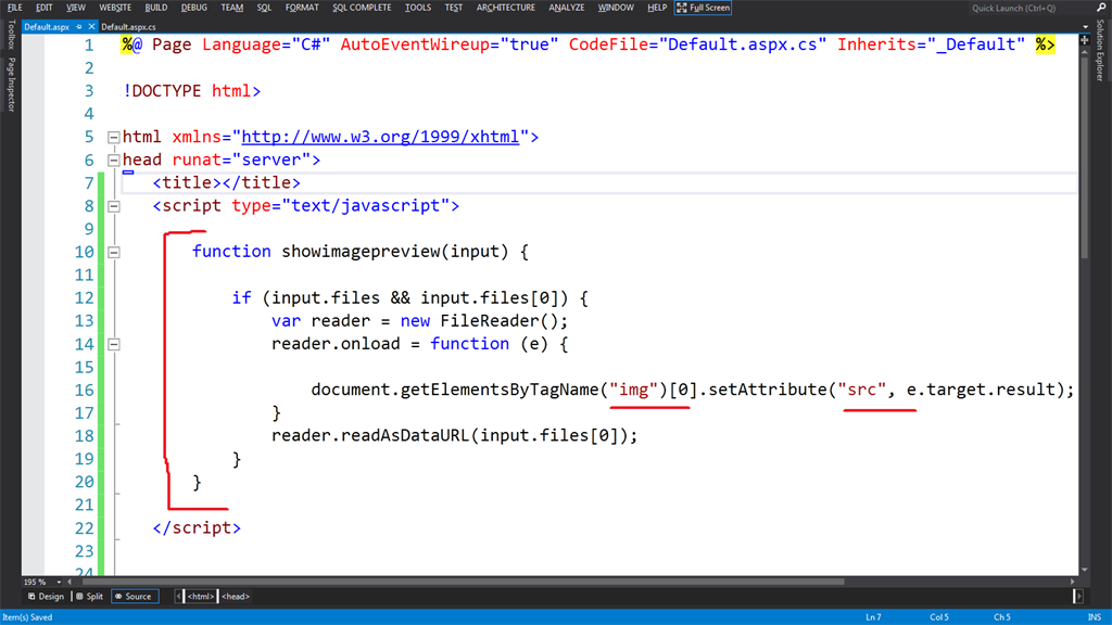 Now I will call this function on the event named "onchange()" on the fileupload control with a parameter "this".