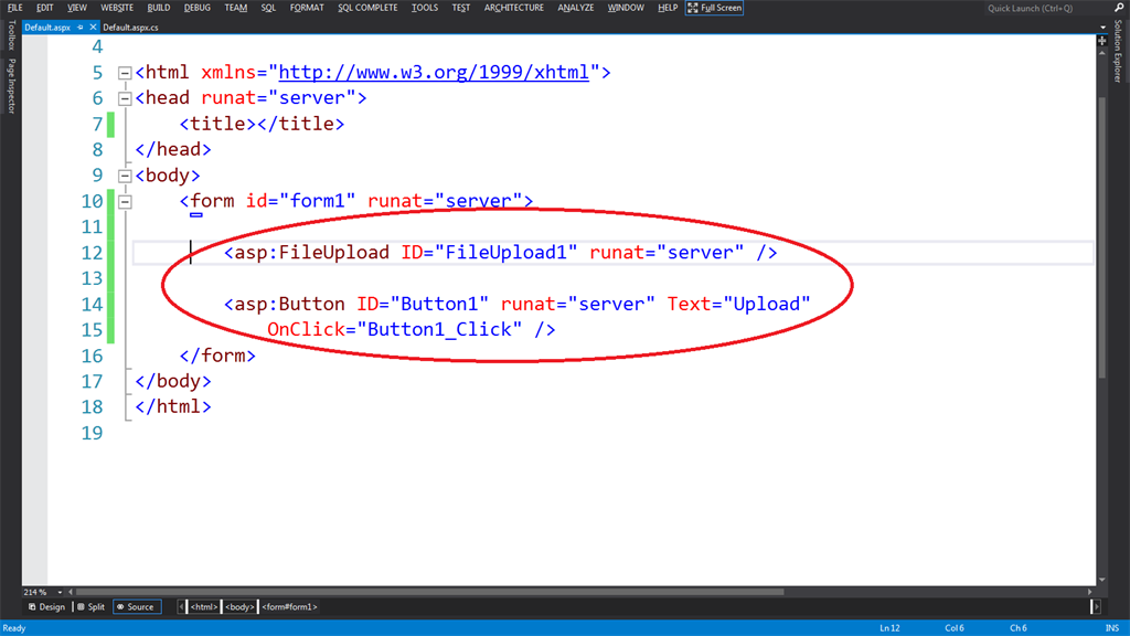 Add a File upload control named "FileUpload1" and button with "Upload" text on the page.