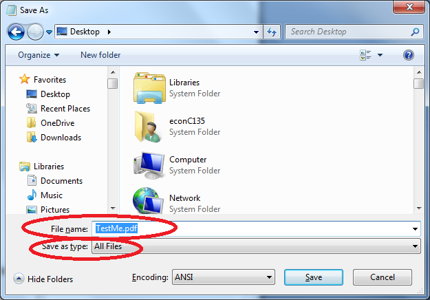 Save the file named "TestMe.pdf" and choose "Save as type" to "All files".
