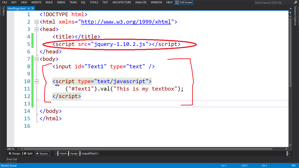 “The data object model loads the code of the HTML page into memory line-by-line or sequentially, so it didn't understand the TextBox control when I wrote the code of jQuery to set the value of TextBox because the control was not yet loaded into memory.”