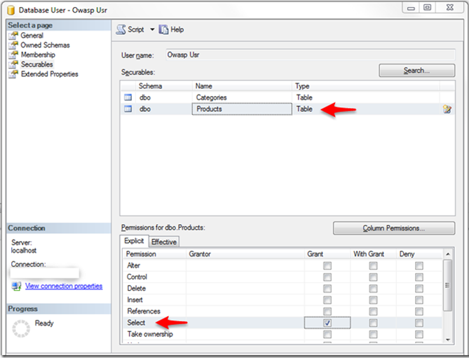 In addition, we can be more restrictive and define exactly what objects and the permissions on those objects that the account has. Again with the SQL Server example restricting this user to only perform SELECT statements on a table called PRODUCTS is done at the user level