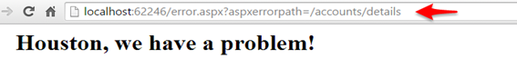The fact that our error page is saved as a Active Server Page Extension is one of those ASP.NET hoops required in order to send back the correct content type (text/html) which properly allows the HTML of our error page to be render properly.