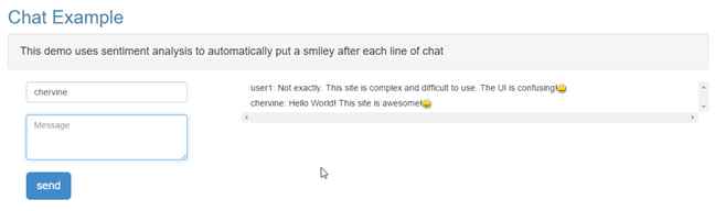 When a user sends a message, the message is first broadcast to all the connected clients. Then, an asynchronous call is made to the Web Service to get the sentiment. After the sentiment score is obtained, the chat is updated with the corresponding smiley.