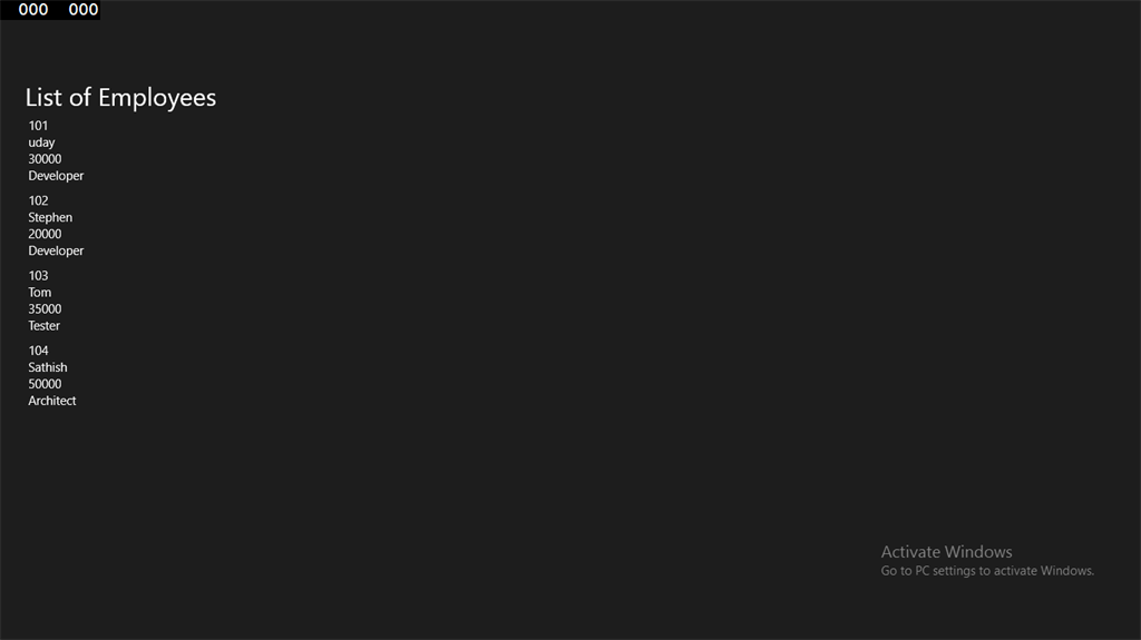 - EmployeeId = 101, EmployeeName = "uday", Designation = "Developer", Salary = "30000", PhoneNumber = "9xxxxxxxx9"