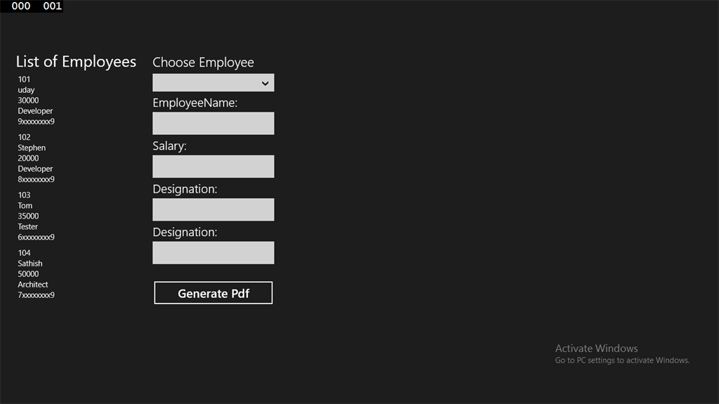 Now to get the information of each employee I added a combobox and the data is bound to the textboxes. If you want to edit you can edit and add a button to generate PDF.