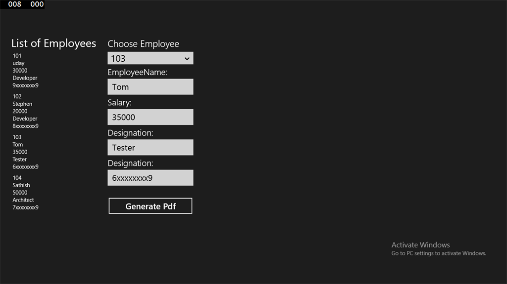 - EmployeeId = 103, EmployeeName = "Tom", Designation = "Tester", Salary = "35000", PhoneNumber = "6xxxxxxxx9"