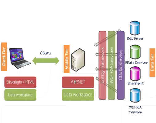 On the client tier we have tools like Silverlight or HTML to build our user interface and also a data workspace, essentially a control space used to manage our data contexts. In the middle tier we have ASP.NET hosting some web services and we have various data sources where our application is gonna speak to.