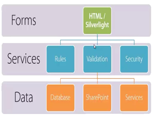The services might include things such as Rules, validations of entites or form inputs and may have security. Data may be a database such as SQL Server might also be a SharePoint or we can access them through services (Restful services or other type of web services).