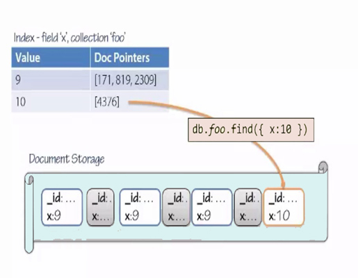 We will design a query to find the documents where the field x matches the value 10. Mongo will look in the index to find the entry whose value is 10 and jump directly to that document. This is much much faster than scanning the entire disk and much much faster than loading each and every document.
