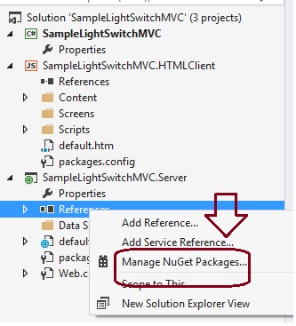 - Step 1: Create a new project by opening Visual Studio 2013 then Click on "File" -> "New Project" then seelct "Create new LightSwitch HTML Application" then name it SampleLightSwitchMVC.