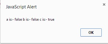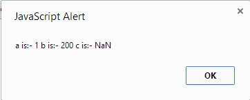 - alert("a is:- " + Number(a) + " b is:- " + Number(b) + " c is:- " + Number(c));